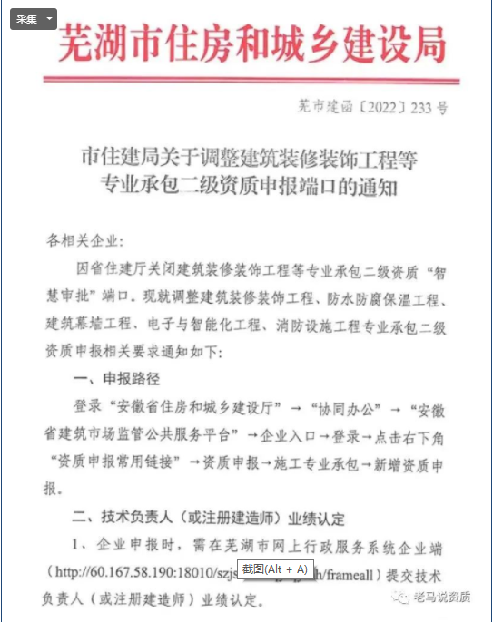 近日,芜湖市住建局发布《关于调整建筑装修装饰工程等专业承包二级资质申报端口的通知》,内容指出: