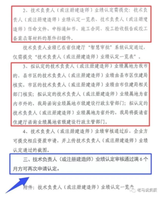 技术负责人(或注册建造师)业绩认定审核通过满6个月方可再次申请认定。