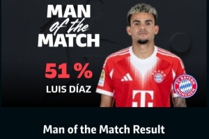 体育资讯3月15日讯 德甲第26轮,拜仁客场1-1战平勒沃库森,赛后拜仁边锋路易斯·迪亚斯51%得票率当选全场最佳球员。