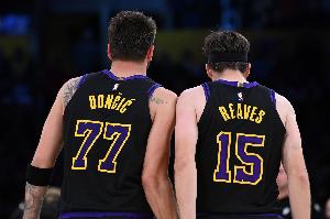 第一节,湖人外线开炮,全队三分13投6中,里夫斯和东契奇各自命中2记三分。