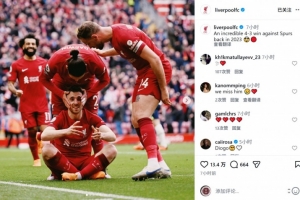 利物浦官方社媒晒出若塔那场比赛庆祝进球的照片,缅怀这位去世的前锋,配文:“2023年那场不可思议的4-3击败热刺的比赛。”