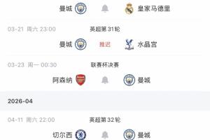 4月国际比赛日后,曼城将在联赛对阵切尔西和阿森纳!